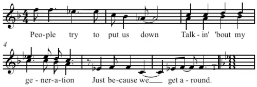 The vocal melody of "My Generation" is an example of the shout-and-fall modal frame. This call and response is mirrored in the instrumental break with solo emphasis passing from Townshend's guitar to Entwistle's bass and back again several times.