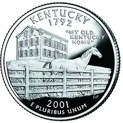 On June 1, 1992, a 29-cent stamp was issued honoring the park.[12] The Federal Hill mansion was also chosen to be one of the icons featured on the Kentucky State Quarter. To the right of the stately mansion, an inscription on the coin reads "My Old Kentucky Home". It was the 15th state quarter, released on October 18, 2001, denoting the fact that Kentucky was the 15th state to join the United States. The official ceremony revealing the quarter was held in the park, and was said by then-governor Paul E. Patton that the mansion and the accompanying thoroughbred were: "...the two most visible, beloved symbols in Kentucky".[13]