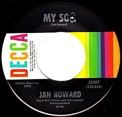 In November 1968, the song (now titled "My Son") was released as a single by Decca Records. It was issued on a 7" vinyl record format featuring a cover of Bill Anderson's, "The Tip of My Fingers", on the B-side.[9] "My Son" made its debut on the US Billboard Hot Country Songs chart on November 23, 1968. Spending 14 weeks there, it rose to the number 15 position on January 18, 1969. It ultimately became her sixth single to make the US country top 20.[10] In Canada, "My Son" peaked at number 28 on the RPM Country Singles chart. It was Howard's final single as a solo artist to chart in Canada.[11] The song was featured on Howard's seventh studio record, which was released in June 1969.[8] Her performance of the song then received a nomination from the Grammy Awards in 1969, becoming one of two songs in her career to receive a nomination.[12]