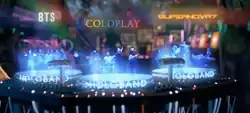 A music video directed by Dave Meyers was released on 30 September 2021.[34] Set in the Spheres planetary system, where music has been banned by the "Silencers", who appeared in Coldplay's 2011 album Mylo Xyloto.[35][36] The video depicts Coldplay, BTS, and the fictional alien band Supernova 7 performing "My Universe" together. Though located on different planets, the three groups are united as holograms through "HOLOBAND" technology controlled by alien DJ Lafrique, who broadcasts their performance throughout the system from her radio ship while being hunted by the Silencers.[37] Coldplay filmed the video at an empty, abandoned municipal swimming pool complex in Rubí, Barcelona, in July 2021. The BTS portion was shot on a green-screen stage at a studio in Seoul, South Korea, two weeks after the Barcelona shoot.[38][39] The green screen was useful to make the visual effects, such as the groups' holographic versions, and to unite the scenes from both groups.[40]
