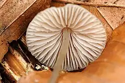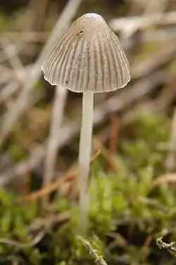 The cap is 1–3 cm (0.4–1.2 in) in diameter, and initially a fat conical shape with the margin pressed close to the stem. As the cap expands, it becomes broadly conic to convex, sometimes broadly bell-shaped, and sometimes convex with a flaring margin.[12] The cap surface has a whitish sheen because of its pruinose coating. The coating gradually sloughs off, leaving the surface smooth and moist. The cap shows radial grooves that outline the position of the gills underneath. Its color is initially dusky brownish-gray to blackish (after the pruinose coating has sloughed off), soon fading from dark to light gray and finally ashy-gray. The flesh is thin and fragile, grayish, and has a slightly sour (acidulous) taste, and a weakly alkaline odor that strengthens in intensity if the flesh is crushed. Its edibility is unknown,[13] but it is too small to be of interest.[14]