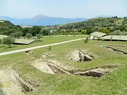 The Mycenaean cemetery of Voudeni (Greek: Μυκηναϊκό νεκροταφείο Βούντενης) along with the Mycenaean settlement at the locality of Bortzi, comprise the Patras Mycenaean Park (Μυκηναϊκό Πάρκο Πατρών), located near the settlement of Voudeni (also known as Skioessa) of the Municipality of Patras in Western Greece. The archaeological site of a total area of 180 acres is located at an altitude of 220 meters, 7 kilometers northeast of Patras, has been transformed into a recreational park. It includes 78 carved tombs[1] and the ruins of a prehistoric settlement, possibly identified with that of ancient Mesatis.[2] First archaeological excavations began in 1923 by Nikolaos Kyparissis. Many of the findings such as vases, clay statuettes, bronze artifacts, tools, weapons and jewellery have been transported and exhibited at the nearby Archaeological Museum of Patras.