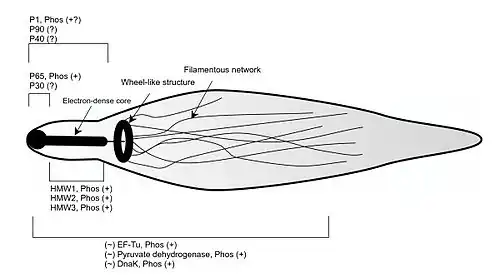- ^ a b c Hahn TW, Willby MJ, Krause DC (March 1998). "HMW1 is required for cytadhesin P1 trafficking to the attachment organelle in Mycoplasma pneumoniae". Journal of Bacteriology. 180 (5): 1270–6. doi:10.1128/JB.180.5.1270-1276.1998. PMC 107017. PMID 9495768.