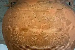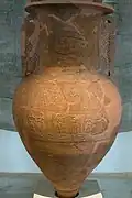 The Mykonos vase, a pithos, is one of the earliest dated objects (Archaic period, c. 675 BC) to depict the Trojan Horse that appears in Homer's telling of the Fall of Troy during the Trojan War in the Odyssey.[a] It was found in 1961 (with human bones inside) on Mykonos, the Greek island for which it is named, by a local inhabitant. Ìt is on display at the Archaeological Museum of Mykonos. [1]