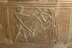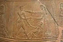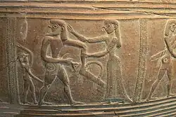 In this piece, the artist chose to present the battle in the city of Troy as a battle against defenseless women and children, there are no Trojan warriors present on the pithos. The artist's decision to separate the scenes of slaughter and link them with the cunning trick of the Trojan Horse serves as a way of focusing the attention of the viewer on the cold bloodedness of the sack of the city and the way the slaughter in the city differed from the fighting on the front lines.