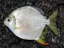 Myloplus arnoldi, Arnold's pacu or yellow fin red hook silver dollar, is a species of freshwater ray-finned fish belonging to the family Serrasalmidae, which includes the pacus and piranhas. This fish is endemic to Brazil.