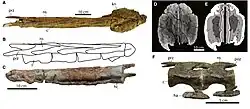 In 1998, a partial skeleton referred to Mymoorapelta was described by Kirkland et al from Cactus Park, Colorado, though at the time the fossil was still undergoing fossil preparation.[5] The skeleton preserved natural molds and body fossils of the sacrum, caudal vertebrae, chevrons (bones attached to the underside of the tail vertebrae in dinosaurs), pes (foot), and many pieces of the dermal armor, including parts of the sacral shield, which was a type of armor that would cover the top of the pelvis. Though skull material was mentioned to be preserved it is still in preparation and undescribed.[6][1] Some of the material, namely from the pes and sacral shield, was preserved in articulation making it the only known articulated specimen of the taxon.[5] In a 2010 abstract, Kirkland and colleagues mentioned the discovery of many more elements of Mymoorapelta at Mygatt-Moore Quarry including a nearly complete skull and every postcranial element except the pubis and femur.[5][7][3] All of the fossils found at Mygatt-Moore Quarry and Cactus Park are currently deposited in the Dinosaur Journey Museum of Western Colorado in Fruita.[3][1]