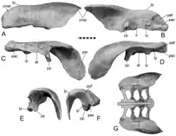 A large part of the postcranial (behind the skull) skeleton of Mymoorapelta is known. For instance, many cervical vertebrae (vertebrae of the neck) are known, though many of them have not been fully researched or excavated. In the cervicals, the faces (ends) of the centra are wider than they are tall and display a heart-shaped morphology. The centra overall are anteroposteriorly short with lengths that are around equal to their width. The neural spines are short and thick, and possess round, circular neural canals. A deep, tear-shaped fossa (small opening in bone) is present between the postzygapophyses (backwards projections of the vertebral arch).[5] Several dorsal (back, sometimes referred to as thoracic) vertebrae are known from Mymoorapelta, and they are unique when compared to those of Cretaceous nodosaurids. The centra are cylindrical, longer posteriorly, and less laterally compressed than those of other, later nodosaurids like Sauropelta and Dracopelta. The anterior dorsals are unique in that they bear a triangular pit between the prezygapophyses (forwards projections of the vertebral arch), which are also much more elongate at the anterior end of the vertebra. Meanwhile, the postzygapophyses are truncated at the posterior end, with the left and right postzygapophyses divided by a large groove. The mid dorsal vertebrae differ in that they are rounded ventrally and have a weak keel at the bottom. The transverse processes of the dorsal vertebrae do not ascend steeply and are instead gradually heightened, similar to the condition in basal ankylosaurs, and differing from that of nodosaurids. Mymoorapelta has 13 ribs, all of which have triangular cross-sections and a weak T-shape, in contrast to other ankylosaurs. Mymoorapelta is also one of the few ankylosaurs with 4 sacral ribs, a trait it shares with only 3 other taxa.[5][13]