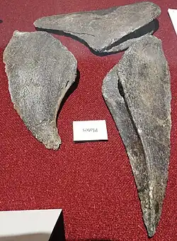 A prominent feature of Mymoorapelta was its armor, which mostly consisted of large spiked osteoderms (bony armor) protruding from the lateral and dorsal sides of the body. These have not been found in articulation, so their exact placement on the body is unknown, though their position can be surmised based on the well preserved skeletons of other nodosaurids and ankylosaurs. In Mymoorapelta, there are five different preserved armor types: elongated spines with a large, hollow base; thin triangular plates with a narrow, asymmetrical base; small bladelike spines with a rounded, solid base; isolated, flat, keeled scutes; and scutes fused into a single plate of armor. The large spine is assumed to have extended from the base of the neck outward laterally, with the point curving posteriorly.[5][1] Evidence from Borealopelta also supports the extension of the spike by a large keratin sheath.[15] The aforementioned thin triangular plates, of which eight are known, are preserved similarly to those in Polacanthus further down the body.[16][1] It was theorized by Kirkland and Carpenter that the largest of these plates were attached to the proximal part of the tail, and protruded laterally along the sides of the body. A specimen of Mymoorapelta preserves one of these at 11 centimetres (4.3 in) in length.[5][1]