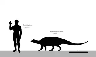 Mymoorapelta is one of the smallest ankylosaurs known and the smallest known quadrupedal dinosaur from the Morrison Formation. However, few individuals have been found and only a portion of the known material has been described in detail. The Cactus Park specimen is the largest described individual, with its length being estimated at around 3 metres (9.8 ft) long in 1998.[5] Body mass estimates based on the type specimen give a weight of around 300–562 kilograms (661–1,239 lb).[10][6][11]