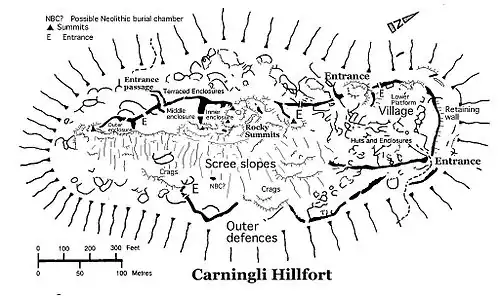 The summit features a large and prominent archeological site; one of the largest hillforts in west Wales.[1] This hillfort, generally dated to the Iron Age and assumed to be from the first millennium BC. It covers an area of about 4 ha, and is about 400 m x 150 m in extent. The lower slopes of Carningli are covered with traces of Bronze Age settlement (Pearson 2001) and so some features of the hillfort may be even older. Although not one of the largest fortified sites in Wales, it is certainly one of the most complex, incorporating a series of substantial stone embankments, natural rock cliffs and scree slopes which may have been used as natural defences. Inside and outside the embankments are terraced enclosures, hut circles and rectangles. Approximately 25 hut circles are at the north east end of the site. On the other side are three enclosures separated by embankments. Beneath the scree slope on the eastern flank of the mountain are two further massive defensive embankments. The only plan is that of Hogg 1973 - it has been modified by Figgis. According to Hogg, there are signs that some of the defensive embankments and walls had been intentionally demolished, which he attributed as "evidence for systematic destruction by Roman invaders in the aftermath of the conquest of Wales".[1] The Royal Commission on the Ancient and Historical Monuments of Wales noted in 2009 that "Such a dramatic interpretation, placing the Roman legions on the slopes of Carn-ingli in an attack on its inhabitants, might be questioned today".[1]