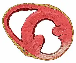 Myocardial scarring is the accumulation of fibrous tissue resulting after some form of trauma to the cardiac tissue.[1][2] Fibrosis is the formation of excess tissue in replacement of necrotic or extensively damaged tissue. Fibrosis in the heart is often hard to detect because fibromas, scar tissue or small tumors formed in one cell line, are often formed.[3] Because they are so small, they can be hard to detect by methods such as magnetic resonance imaging.[1] A cell line is a path of fibrosis that follow only a line of cells.