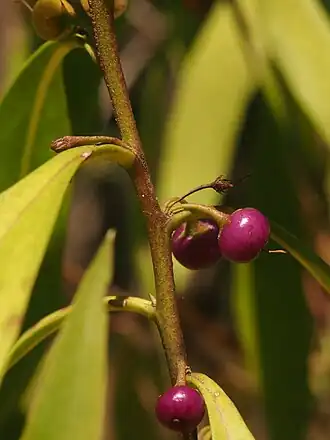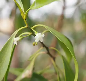 Sweet scented flowers grow in clusters of one to five from the leaf axils, on stalks 4.5–11 millimetres (0.2–0.4 in) long. There are 5 egg-shaped to triangular sepals with slightly papery margins but are only translucent near their base. The flowers feature five, rarely six white or occasionally light pink or purple petals, which may have rows of purple spots. The petals form a tube 2–5 millimetres (0.08–0.2 in) long, with lobes about the same length. The total diameter of the flower is about 6–8 millimetres (0.2–0.3 in). Flowering occurs mostly in winter and summer and is followed by fruits which are smooth or slightly rough drupes. The drupes are ovoid in shape, 5–8 millimetres (0.2–0.3 in) in diameter, light purple, red purple or brown in colour. Remnants of the flower style point out of the fruit.[3][4][5][6]