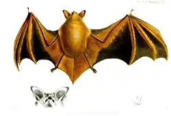 Hodgson's bat (Myotis formosus), also called the copper-winged bat or black-and-orange myotis, is a species of vesper bat in the genus Myotis, the mouse-eared bats. Favouring mountain forests, it is found throughout Central, Southeast, and East Asia, from Afghanistan to Taiwan.[2] It is about 5 centimetres (2.0 in) long and is distinguished from most other species of bat in this range by its yellowish colouration.