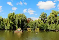 The whole complex is located right in the middle of the city and is spaced out in a large expanse of sandy woodland with the Khorol River providing several areas suitable for bathing. It has a musical fountain, (opened in 2010), and, at night, a large illuminated windmill, (opened in 2011), standing close to the main administrative building. Other features include pedaloes, boats, several restaurants and cafés, dancing, live music, rides through the woods in a horse-drawn carriage, a theatre, organised excursions and a large 'water feature' with geese, ducks (including a couple of Mandarins), a large family of terrapins and some beautiful black swans. Elsewhere in the complex is an enclosure with peacocks and hens, including some rather exotic white ones.