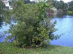 Myrica cerifera is a small tree or large shrub,[3] reaching up to 14 metres (46 ft) tall.[4] It is adaptable to many habitats, growing naturally in wetlands, near rivers and streams, sand dunes, fields, hillsides, pine barrens, and in both coniferous and mixed-broadleaf forests. M. cerifera can weather coastal storms, long droughts, and tropical high temperatures.[5]