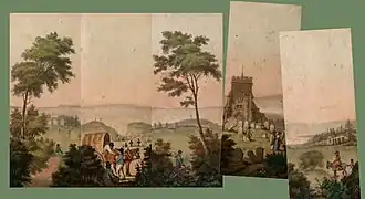 The early myrioramas were cards with people, buildings, and other images on compatible backgrounds, and could be laid out in any order, allowing a child to create a variety of imaginary landscapes. Jean-Pierre Brès, a French children's writer, published an early version which he described as a polyoptic picture (tableau polyoptique) in the early 19th century, and John Clark of London took up the idea and designed a set of cards he called a myriorama. Clark's "second series" myriorama, an "Italian landscape", was produced in 1824,[3] the same year as a similar set of English cards called a panoramacopia created by drawing teacher T.T.Dales.[4]