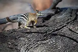 The numbat (/nəm-ˌbæt/ ⓘ; binomen: Myrmecobius fasciatus), also known as the noombat or walpurti,[4][5] is an insectivorous marsupial. It is diurnal and its diet consists almost exclusively of termites.