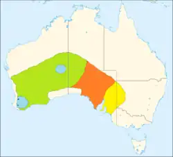 The species was once widespread across southern Australia, but is now restricted to several small colonies in Western Australia. It is therefore considered an endangered species and protected by conservation programs. Numbats were recently re-introduced to fenced reserves in South Australia and New South Wales.[6][7][8][9] The numbat is the faunal emblem of Western Australia.[10]