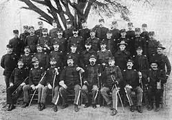 In early 1898, as many American politicians were calling for U.S. intervention in Cuba, McCord remained silent. The Arizona Gazette editorialized this by saying "Governor McCord in about the only executive that hasn't declared war. Hadn't you better move on the enemy, governor?"[22] While publicly silent about Cuba, the governor sought permission to raise a regiment of volunteers behind the scenes.[23] Permission arrived on April 3, 1898, when McCord received a telegram authorizing raising two companies of volunteer cavalry. The governor quickly responded by recommending James H. McClintock and Buckey O'Neill be appointed company commanders with Alexander O. Brodie recommended for the position of battalion commander. O'Neill began recruiting in the northern half of the territory while McClintock worked the south.[24] With 210 slots to fill, the territory saw roughly 1000 men volunteer for service.[25] The two companies of volunteers became part of the Rough Riders. After their arrival in San Antonio the group was reorganized into three companies with Joseph L. B. Alexander appointed captain of the third company.[26]
