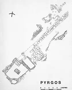Pyrgos (also Myrtos-Pyrgos; Greek: Πύργος [στο Μύρτος]) is an archaeological site of the Minoan civilization near Myrtos in the municipality of Ierapetra on the south coast of Crete. Pyrgos provides evidence of settlements along the southern Ierapetra Isthmus. This site has had a long history due to its valuable location and geography. It is located close to the Myrtos valley and has a harbor with a nearby mountain range providing its protection. The settlement includes a courtyard, many rooms, a country house and a tomb.[1]