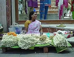 (Kannada: ಮೈಸೂರು ಮಲ್ಲಿಗೆ This is the most well-known variety, which derives its name since it is grown mostly around Mysore city and partly in Srirangapatna taluk in Mandya district in Karnataka state. The Jasmine's association with the city of Mysore, the royal city of palaces, patronized by the Wodeyar of the Kingdom of Mysore, because its fragrance is as powerful as the famous Dasara festival held every year in the city during October.[3] Mallige grows in profusion in the open areas either in exclusive farmland, in front or at the backyard of houses.