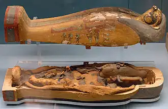 None of these statuettes have been discovered at Abydos during archaeological excavations. This description, however, agrees with later artifacts discovered on other sites and known under the scholarly name of “vegetating Osiris” (as know in English: Corn mummy; in German: Kornosiris / Kornmumie ). The latter, around fifty centimeters high, are frequently decorated with gold leaf or placed in small golden sarcophagi with falcon heads.[37]