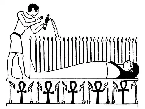 The culminating moment of the mysteries is the implementation of the regeneration of Osiris in the “Abode of Gold”, probably located near the tomb. According to the words of King Neferhotep I of the 13th Dynasty, a new statue was made from gold and electrum. The texts do not, however, specify the time of this rite, which must have taken place during the preparations for the processions or after the funeral of the previous statue. During Haker Night, an officiant was supposed to capture the spirit of Osiris so that the statue could be considered alive and inhabited by the god. This night corresponds, in the funerary cult, to the night of justification, where the judgment of the dead is ritualized during nightly vigils. This accomplished, the news was announced to the living and the dead, in common exultation. The statue then left Ro-Peqer in a sacred boat to reach the temple.[35]