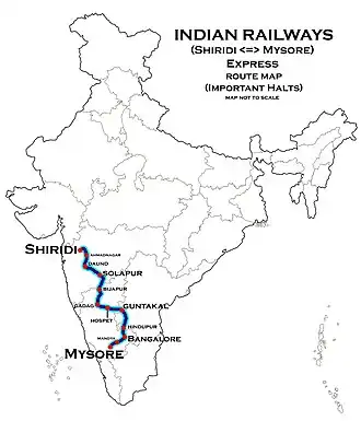 The 16217 / 18 Mysore–Sainagar Shirdi Express runs from Mysore Junction via KSR Bengaluru, Dharmavaram Junction, Guntakal Junction, Ballari Junction, Gadag Junction, Vijayapura, Solapur, Daund Junction, Ahmednagar, Puntamba to Sainagar Shirdi.