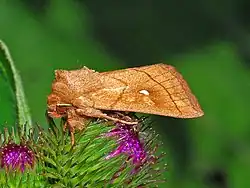 The wingspan is 30–35 mm. [4] Forewing smooth pale ochreous suffused with brown except along costa; Forewing pale fulvous suffused with darker: lines fine, brown; inner line angled on submedian fold: outer sinuate, nearly parallel to outer margin; orbicular and reniform stigmata pale, indistinct, except lower lobe of reniform, which is marked by a snowwhite spot, and is often surrounded by a grey cloud: hindwing pale rufous, darker towards termen: -suffusa Tutt is a melanic form, without any yellow tint, from North England and W. Ireland.