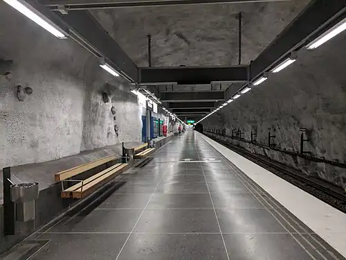 Näckrosen (meaning the water lily) is a station on the Stockholm metro, blue line. The station is located in Solna Municipality (northwestern end of Råsunda area), but one of the entrances is in Sundbyberg Municipality (Storskogen square). The Näckrosen station was opened on 31 August 1975 as part the first stretch of the Blue Line between T-Centralen and Hjulsta. The trains were running via Hallonbergen and Rinkeby.[2] It is located deep underground under a residential area, close to the Gamla Filmstaden former movie production area.