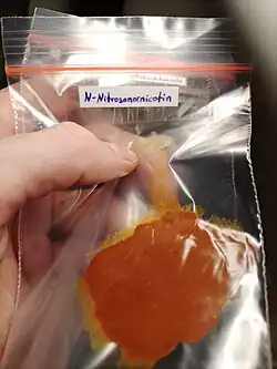 NNN is found in a variety of tobacco products including smokeless tobacco like chewing tobacco and snuff,[3] cigarettes, and cigars. It is present in smoke from cigars and cigarettes, in the saliva of people who chew betel quid with tobacco, and in the saliva of oral-snuff and e-cigarette[4] users. NNN is produced by the nitrosation of nornicotine during the curing, aging, processing, and smoking of tobacco.[5] Roughly half of the NNN originates in the unburnt tobacco, with the remainder being formed during burning.