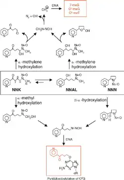 - ^ Zarth, Adam T.; Upadhyaya, Pramod; Yang, Jing; Hecht, Stephen S. (2016-03-21). "DNA Adduct Formation from Metabolic 5′-Hydroxylation of the Tobacco-Specific Carcinogen N′-Nitrosonornicotine in Human Enzyme Systems and in Rats". Chemical Research in Toxicology. 29 (3): 380–389. doi:10.1021/acs.chemrestox.5b00520. ISSN 0893-228X. PMC 4805523. PMID 26808005.