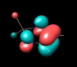 Computational studies and photoelectron spectroscopy create a more nuanced picture of electronic structure and π-electron sharing in NHSis. Relevant π bonding orbitals in unsaturated five-membered NHSis can be understood as the molecular orbital mixing of the diimine backbone's butadiene-like pi orbitals and the 3s and 3p orbitals of Si. Photoelectron Spectra of the unsaturated [tBuN−CH=CH−tBuN]Si: show a HOMO with three peaks at -6.96eV, -7.13eV & -7.28eV, assigned the in-phase overlap of the Si 3py orbital and buta-1,3-diene-like π3 of the diimine. The HOMO in the tetravalent Si-hydrogenated analog lacks a vacant Si 3py orbital and the energy of the π3 is destabilized to -6.56 eV, supporting charge donation from N to Si in the silylene. The HOMO-1 is the in-plane Si lone pair involved in σ donation. No difference is calculated between the HOMO-2 for the unsaturated silylene compared to the corresponding orbital of the silane analog. The original 1994 Denk at al. photoelectron spectroscopy communication relates this orbital to the π2 diimine orbital, however a 1996 paper from Blakeman et al. designates this as the nitrogen lone pairs. Either way, both orbital assignments are symmetrically forbidden from overlapping with any Si orbital. The HOMO-2 does not change in energy upon hydrogenation at Si indicating that much of the overall electronics are unchanged by hydrogenation and underscoring the effects of N to Si electron π-donation in the HOMO and HOMO-3. Calculations in the former study at the MP4 6-31G* level showed increased energy level spacing for N-H model compounds (instead of N-tBu), but with the same order and proportional spacing.[5][9] The Blakeman study compared the benzo-fused NHSi to the ethylene-like unsaturated NHSi, and found by PES that the HOMO is lower by .36eV and the Si lone pair by .34 eV in the benzo-fused NHSi, suggesting the electron withdrawing power of the phenylene ring makes the benzo-fused NHSi less nucleophilic.[9]