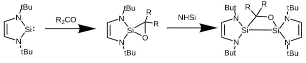 Generally, when reacting with unsaturated species an NHSi will add across a double or triple bond to form a spirocyclic compound, containing one or two equivalents of NHSi-derived silicon. Alkenes and alkynes react with NHSis only if their C-C bond is highly polarized such as is the case with phenyltrimethylsilylacetylene, which produces a silicocyclopropene with one NHSi equivalent or a disilicocyclobutene with two. With ketones two equivalents of benzo-fused NHSi react to form disilyloxetanes as well as further reaction products depending on the carbon substituents.