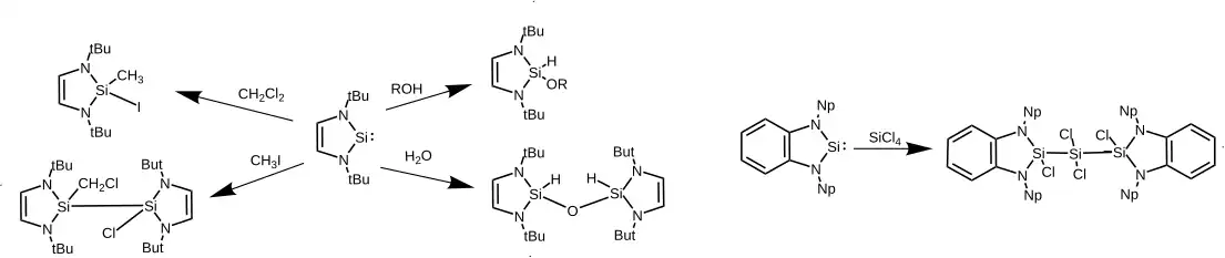 NHSis insert into σ bonds to form terminal silane-like products, NHSi-NHSi disilane bridges, or oxo-bridged NHSi siloxanes. Alcohols react with Si(II) to form exclusively the silyl ether. With water, two NHSis will insert to each of the O-H bonds to form a siloxane. A more varied reactivity is seen with haloalkanes. NHSis insert directly into the C-I bond of iodomethane. Alternatively, when saturated or unsaturated NHSis are reacted with dichloromethane, chloroform, or carbon tetrachloride, the silicon centers of two NHSis form a bond, with one halide adding to one silicon and the remaining organic fragment adding to the other. Other halocarbons will yield a mixture of mono and disilane products. The resulting mixture of products as well as computational studies indicate that a free radical mechanism brings about these products, with the radical pathway being 16 to 23 kcal/mol lower in energy than concerted mechanisms. Upon heating, the disilanes either disproportionate to an NHSilane and NHSilylene, or form a one-carbon bridge between two NHSi-X fragments in a vein similar to water's reactivity. In the presence of silicon tetrachloride, benzo-fused NHSis will insert between two Si-Cl bonds to form a trisilane.[14][4]