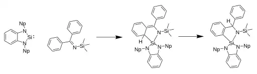 Imines do not form simple cyclic silylene additions: benzo-fused NHSis react with the diimine and ortho carbons of N-tert-butyl phenylimine to form a five-membered ring composed of the NHSi silicon, one carbon and nitrogen of the imine and the ipso and para carbons of the phenyl group, through an intermediate that breaks the phenyl aromaticity.[15]