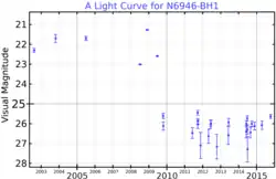 N6946-BH1 is a disappearing supergiant star and failed supernova candidate formerly seen in the galaxy NGC 6946, on the northern border of the constellation of Cygnus. The star, either a red supergiant[1] or a yellow hypergiant,[3] was 25 times the mass of the Sun, and was 20 million light years distant from Earth. In March through to May 2009 its bolometric luminosity increased to at least a million solar luminosities, but by 2015 it had disappeared from optical view. In the mid and near infrared an object is still visible; however, it is fading away with a brightness proportional to t−4/3. The brightening was insufficient to be a supernova;[1] the process that created the outburst is still uncertain.