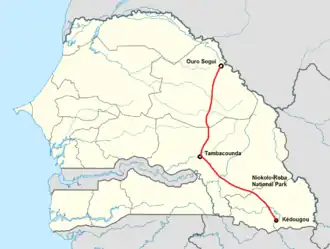 The road runs in a southerly direction from Ouro Sogui to Tambacounda where it crosses the N1 road before heading south-east, via the Niokolo-Koba National Park, to Kédougou on the borders of Mali and Guinea.