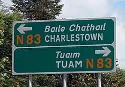 The N83 road is a national secondary road in Ireland that runs (north to south) from its junction with the N17 just south of Ireland West Airport in County Mayo to a point just north of Tuam, County Galway where it rejoins the N17. On 27 September 2017, the old N17 from the Kilmore Roundabout in Tuam to the junction with the N6 in Galway city was redesignated as the N83.