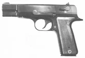 The Brigadier is a pistol developed by the North America Arms Corporation (NAACO) to meet Canadian requirements for a service handgun in the aftermath of World War II. It was based largely on the FN GP35 Hi-Power self-loading pistol of 1935 but scaled up significantly. Whereas the Hi-Power used the 9×19mm cartridge, the NAACO Brigadier used a new long-case .45 inch round of greater length and much greater power than the then-standard .45 ACP. With a standard 230-grain (15 g) bullet, the .45 NAACO cartridge could produce muzzle velocities of up to 1,600 feet per second (490 m/s), or almost twice as fast as the .45 ACP. In order to keep weight down, the pistol used an aluminium frame, but still weighed more than four pounds, unloaded. Its box magazine could carry eight rounds of ammunition. A removable trigger module allowed for a fully automatic configuration, complete with an attachable butt-stock. This would produce a sub-machine gun configuration called the Borealis (never constructed). Gunsmith Robert Herman and Designer Russell Sutherland spent a year developing the prototype.