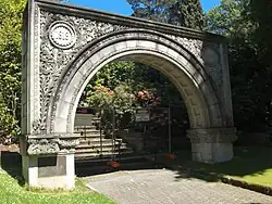 The tall sandstone archway which stood over the entrance to the original 1913 building was donated by AMP in 1968 to the Royal Tasmanian Botanical Gardens, where it received a decorative carving commemorating the foundation of the Gardens and the re-erection of the archway.[5] The arch has since been a large feature of the gardens, and a plaque is fitted to it discussing the Gardens and the AMP donation.