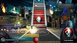In the game, various instructions to handle the basketball scroll down a lane on screen. Players are instructed to handle the ball various ways, including dribbling it in the left or right hand, passing it from one hand to another, dribbling between legs or faking a pass, all to the rhythm of the in-game music.[3] The more accurate and timely the player's motions are, the more points are awarded.[4] In this respect, the game has been considered as a possible way to teach basic basketball handling skills to novices.[5] A tutorial mode called "Beat School" can assist players with the various moves.[6]