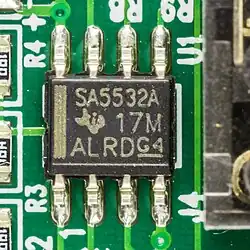 The NE5532, also sold as SA5532, SE5532 and NG5532 (commonly called just 5532) is a dual monolithic, bipolar, internally compensated operational amplifier (op amp) for audio applications introduced by Signetics in 1979. The 5532 and the contemporary TL072 were the first operational amplifiers that outperformed discrete class A circuits in professional audio applications. Due to low noise and very low distortion, the 5532 became the industry standard for professional audio.[1][2] According to Douglas Self, "there is probably no music on the planet that has not passed through a hundred or more 5532s on its way to the consumer".[3] The performance of the 5532 remained best in class for almost thirty years, until the introduction of the LM4562 in 2007.[4] As of 2021, the 5532 remains in mass production as a generic product.