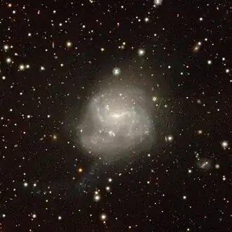 The overall form of this galaxy is irregular with spiral arms and the appearance of tidal features, suggesting a potential recent merger event. There is no central bulge of significance.[8] The morphological classification is SAB(rs)cd,[5] which indicates a barred spiral galaxy (SAB) with a transitional inner ring structure (rs) and loosely wound spiral arms (cd). It is a star forming galaxy with a formation rate of 3.8 M☉·yr−1.[5] There is a plume extending to the south of the galaxy.[8]