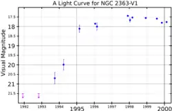 - ^ a b c Petit, Véronique; Drissen, Laurent; Crowther, Paul A. (2006). "Spectral Evolution of the Luminous Blue Variable NGC 2363-V1. I. Observations and Qualitative Analysis of the Ongoing Giant Eruption". The Astronomical Journal. 132 (5): 1756. Bibcode:2006AJ....132.1756P. doi:10.1086/506512.