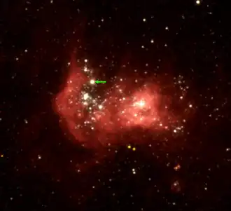 ![]() The H II region NGC 2363 as seen by the Hubble Space Telescope. The green arrow points to NGC 2363-V1.[1] Credit: NASA/ESA | |