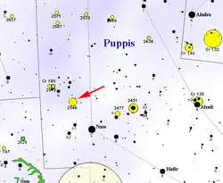 NGC 2546 is a pair of independent but overlapping open clusters[2] located in the southern constellation of Puppis. This grouping was discovered by French astronomer Abbe Lacaille in 1751-1752 from South Africa.[3][6] NGC 2546 is just visible to the naked eye as a fuzzy patch; the brightest component has an apparent visual magnitude of 6.44. The brighter members are readily resolved with a pair of 10×50 binoculars.[4]