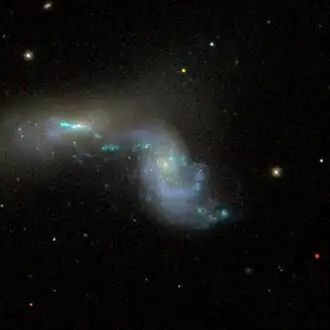 NGC 3395 forms an interacting pair with NGC 3396, a magellanic spiral galaxy that lies 1.5 arcminutes from the nucleus of NGC 3395. The mass ratio of the two galaxies is about 1.5 to 1. The two galaxies appear separate but a bridge of material is visible between them and tidal tails are observed.[4] Dynamical modelling of the pair suggests that the two galaxies had a first close encounter in the past, which resulting in gas been stripped from NGC 3395 and forming a tidal tail to the south-east.[5] A second close encounter took place about 50 million years ago, resulting to starburst activity. The two galaxies will most likely merge in the next 500 million years.[5]