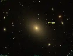 NGC 533 is an elliptical galaxy in the constellation Cetus. It was discovered on October 8, 1785, by William Herschel. It was described as "pretty bright, pretty large, round, gradually brighter middle" by John Louis Emil Dreyer, the compiler of the New General Catalogue.[4]